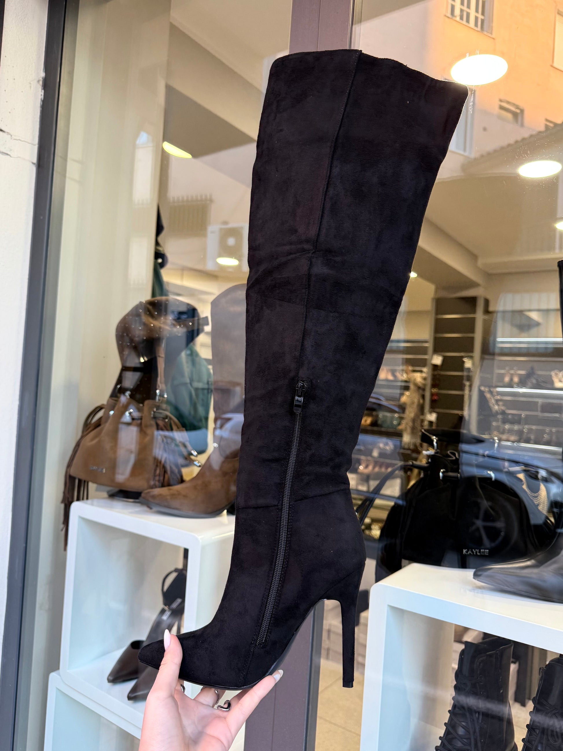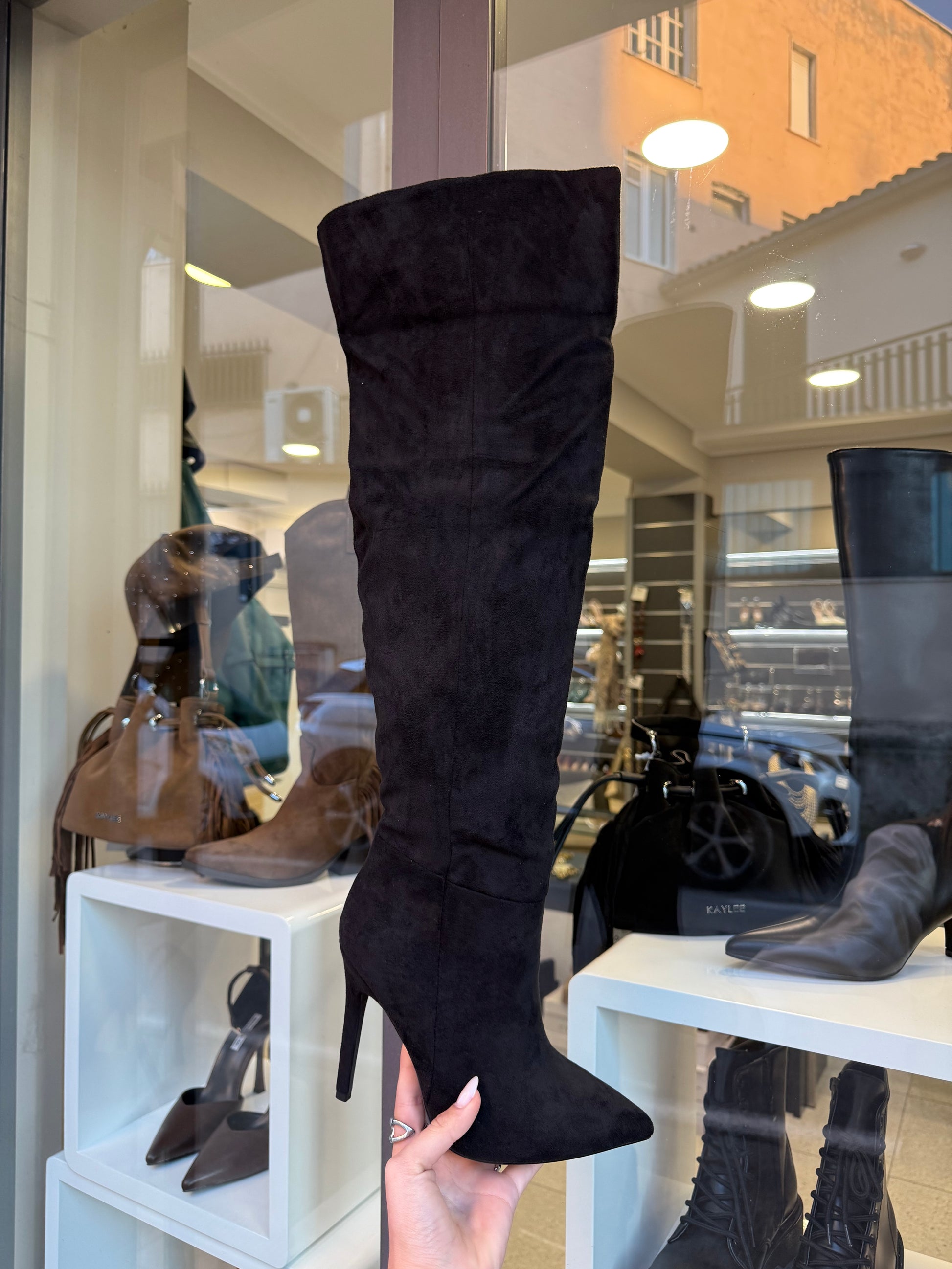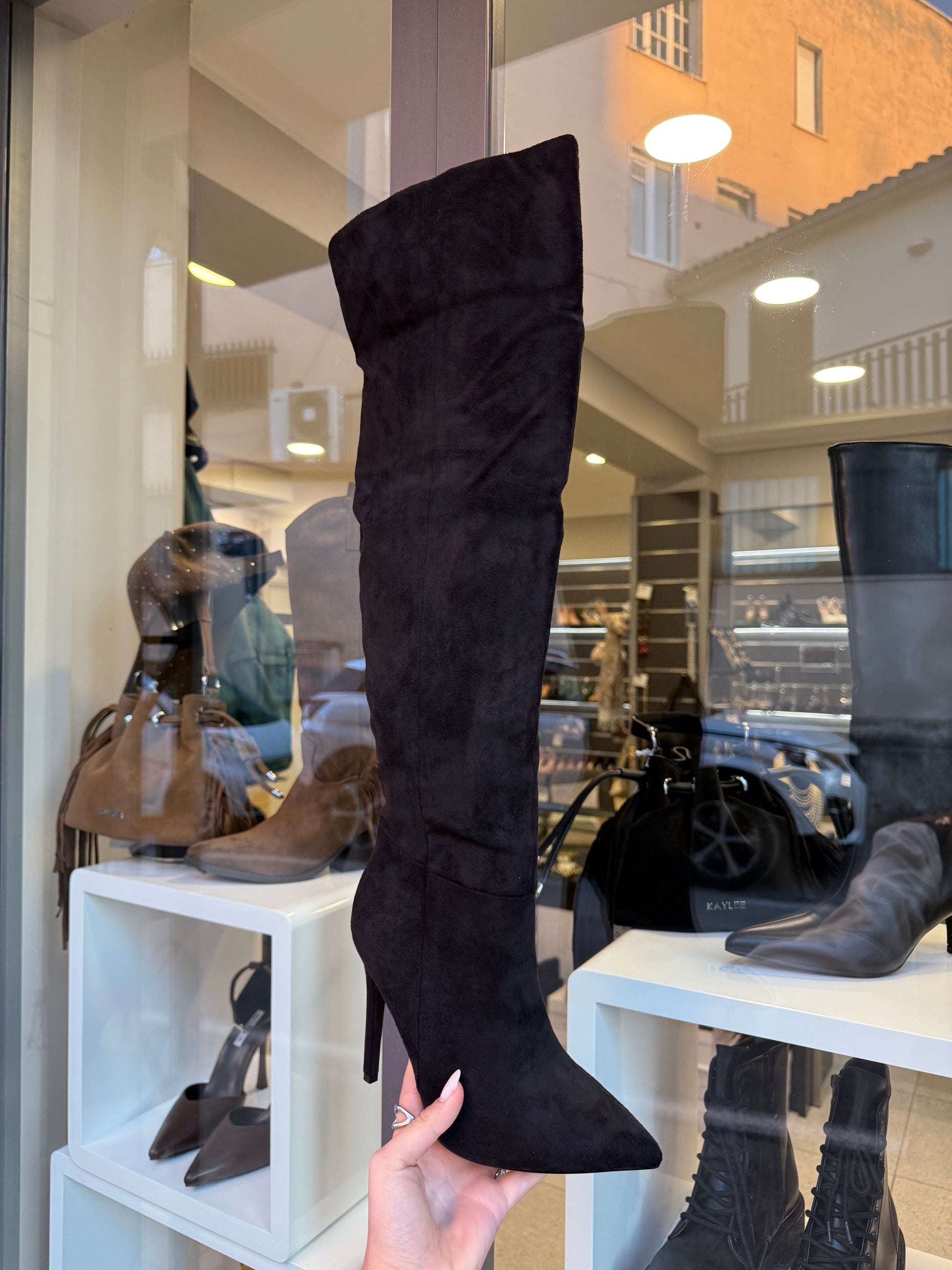 stivali scamosciati sul ginocchio che può essere ripiegato e scendere sul polpaccio