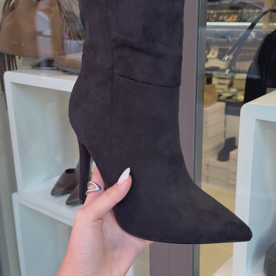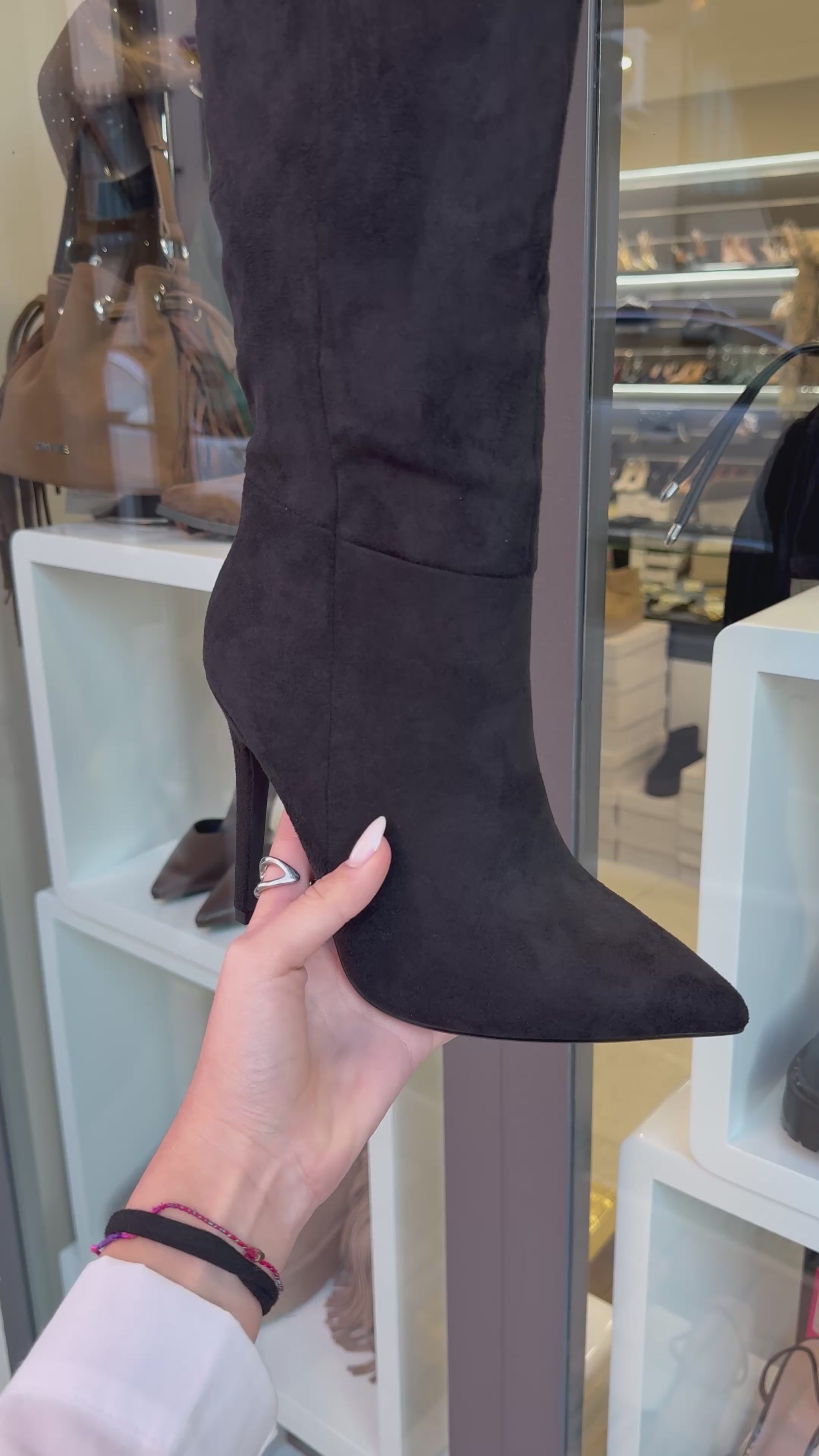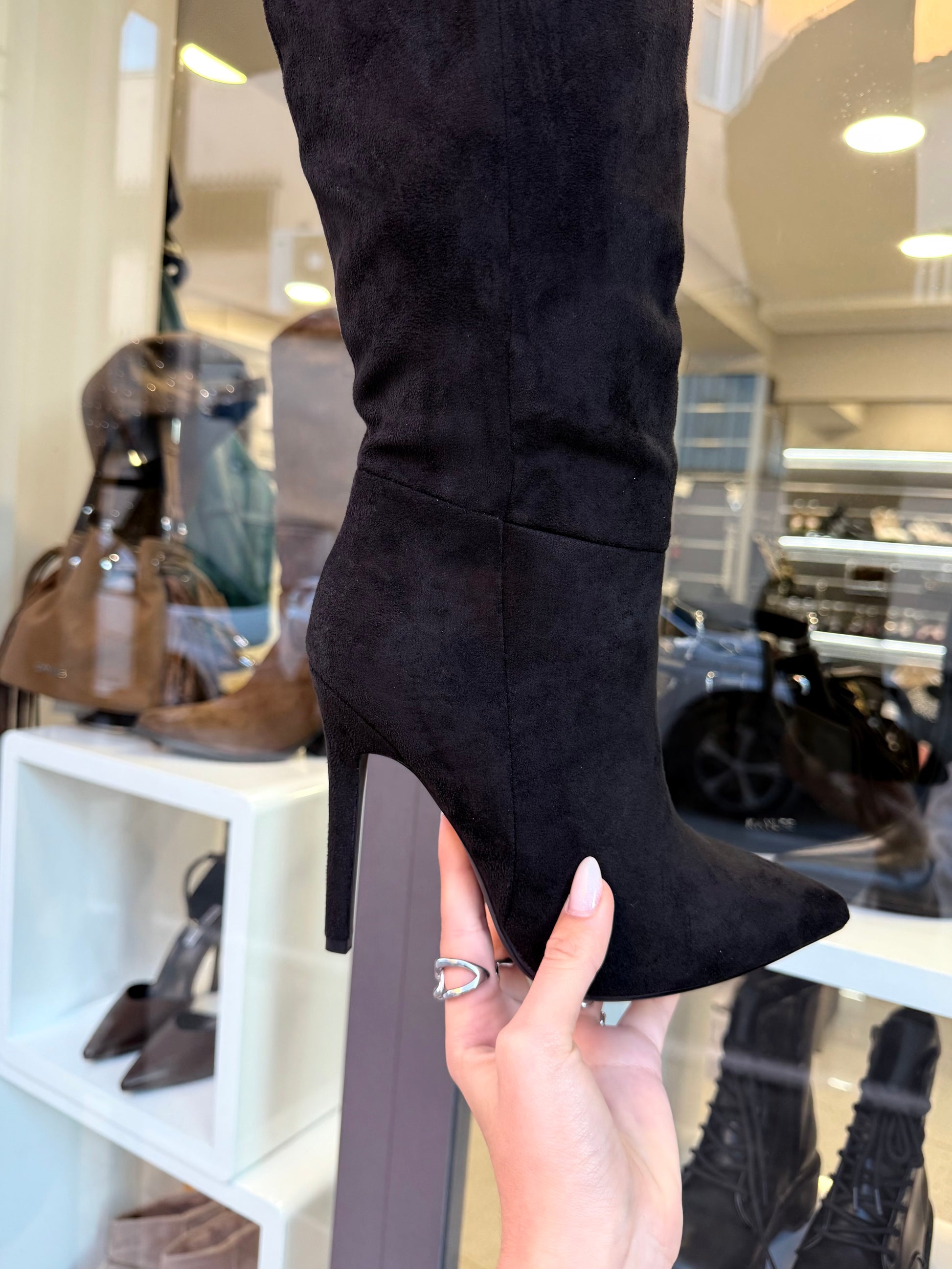 stivali scamosciati sul ginocchio che può essere ripiegato e scendere sul polpaccio